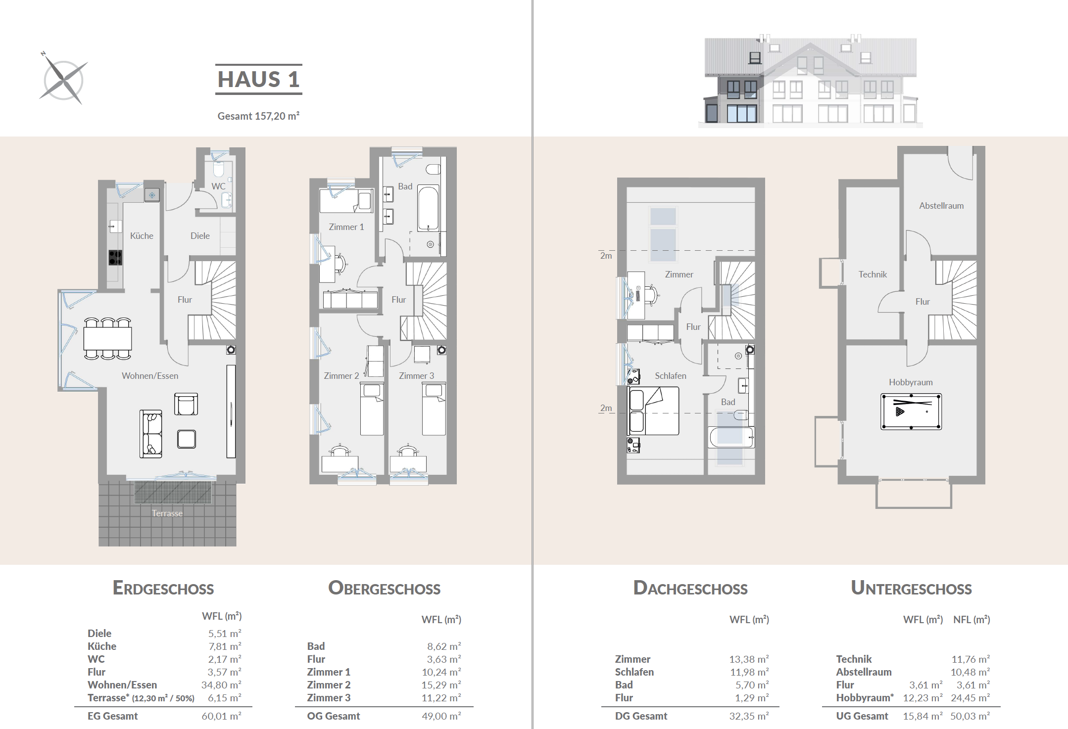 Jedes der vier Reihenhäuser verfügt über ein EG, OG, DG und einen Keller. Die beiden Eck-Reihenhäuser haben eine Größe von 157,20 m² und die beiden anderen eine Größe von 154,51 m². Die groß angelegten Terrassen und Gärten laden zum Sonnenbad ein.