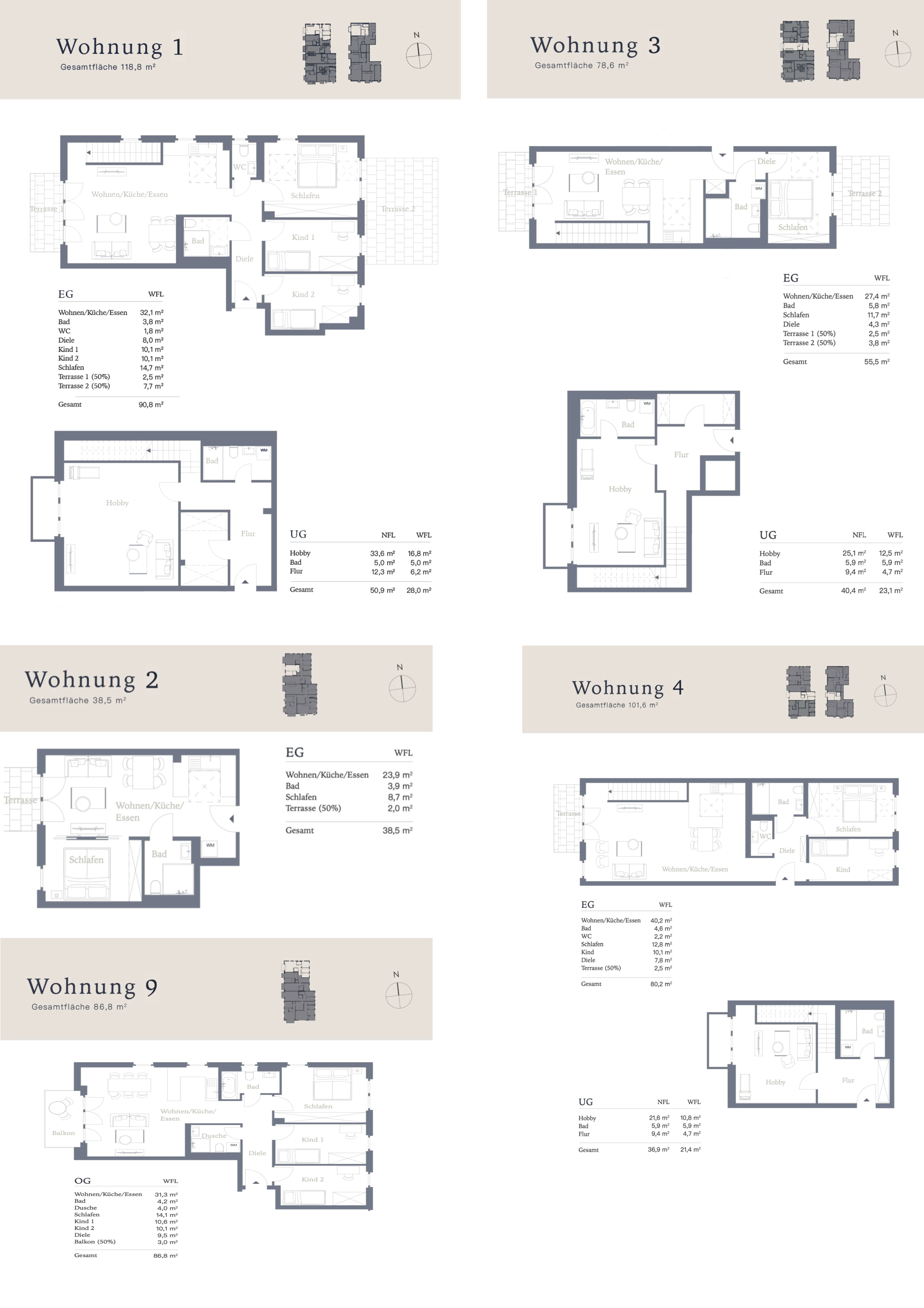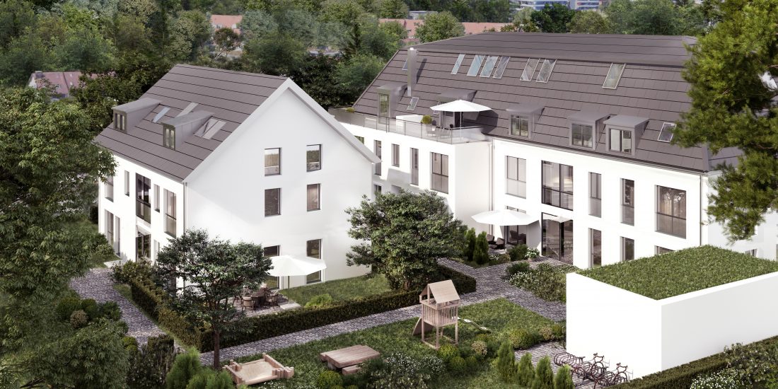 Auf insgesamt 1.850 qm Wohnfläche verteilen sich 22 Wohnungen von der 1,5 Zimmer Wohnung mit 37,5 qm bis zur 5 Zimmer 123 qm Dachgeschoss Maisonette Wohnung. Großflächige bodentiefe Fenster sorgen für lichtdurchflutete Wohnungen. Es gibt Aufzüge vom UG bis ins DG. In einem Haus auch 2 Wohnungen, die direkt mit dem Aufzug erreichbar sind.